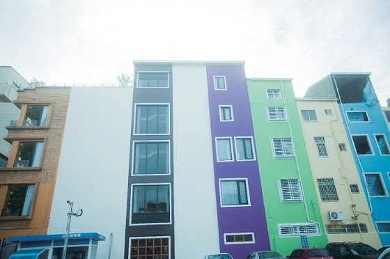 隔壁的停車場是以前南都戲院的所在地,台南古根店與旁邊的住戶取得共識,替房子牆壁修整後,漆上了五彩繽紛的色彩,妝點台南成為城市新亮點。而緩慢文旅本身這棟建築的前身,是歇業許久的遠東大旅社,在重新整修裝潢的同時,仍保留了部分老旅社的痕跡,例如:樓梯一半保留著磨石子地板、房間的天花板還保留著老裝飾、甚至刻意在房間裡保留一面外裸的紅磚牆,感受新舊交融的時代軌跡。