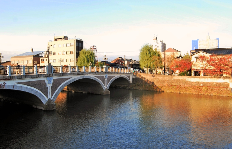 另外一種走法是從金澤周遊巴士下車地點,沿著淺野川大橋畔的東山河岸綠地散步,春天時,櫻花飄逸著優雅身影,夏天綠意無限,秋季期間樹葉轉紅,到了冬季雪色蒼茫一片,更增添北國古都風韻。