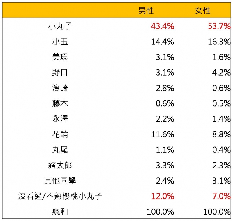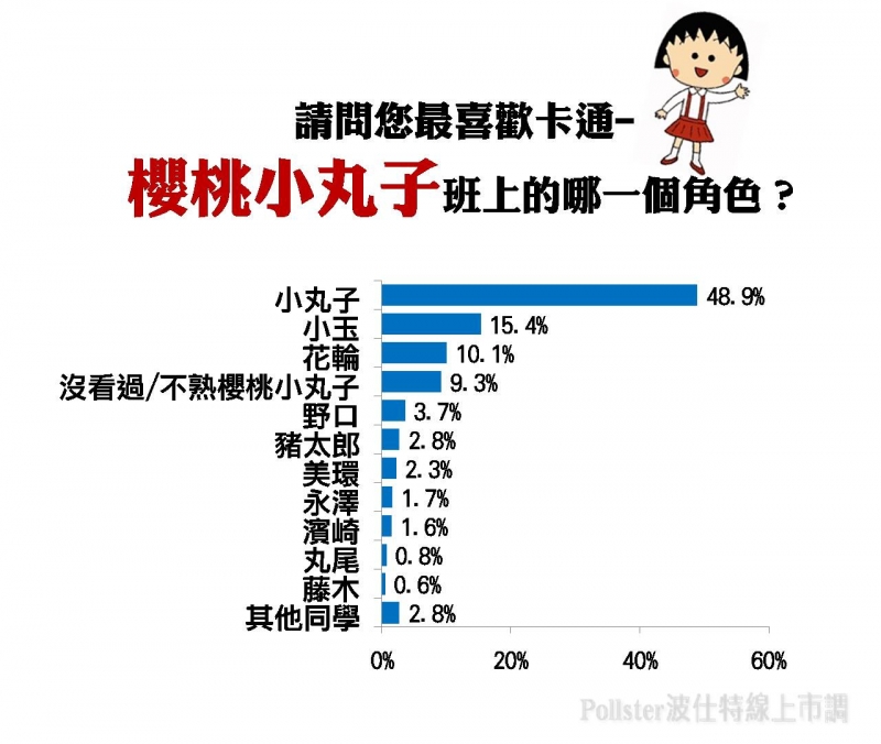 Pollster波仕特線上市調網針對1,729位受訪者詢問「請問您最喜歡卡通-櫻桃小丸子班上的哪一個角色?」,結果顯示以「小丸子」的受訪者占多數,約為整體受訪者之48.9%;其次為「小玉」,占15.4%;「花輪」則排名第三,占10.1%。從調查數據中可得知,卡通「櫻桃小丸子」中,小丸子班上的同學,最受歡迎的前三名分別為單純迷糊的「小丸子」、性情文靜善良的「小玉」及家境優裕的「花輪」;而個性懦弱的「藤木」(0.6%)及一心想當班長的「丸尾」(0.8%)人氣則較低;此外,約一成(9.3%)的民眾表示「沒看過/不熟櫻桃小丸子」。