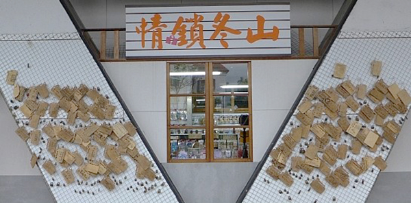 記得這座沒有天橋或地下道的車站,要搭車前還得大大方方穿越過鐵軌才能搭上車。 此外,車站設有販賣部,除了鐵道紀念品外,在店外還有一面「情鎖冬山」的鎖頭牆,除了將鎖頭鎖在牆上外,也可以買份「留言板」,將你的愛的宣言或是心願通通掛在牆上。冬山鄉是「風箏」的故鄉,來到車站外就有一座巨型「風箏」裝置藝術,在車站內外還有許多風箏的意象的造景,就連月台候車座椅也是風箏造型。
