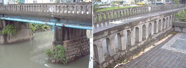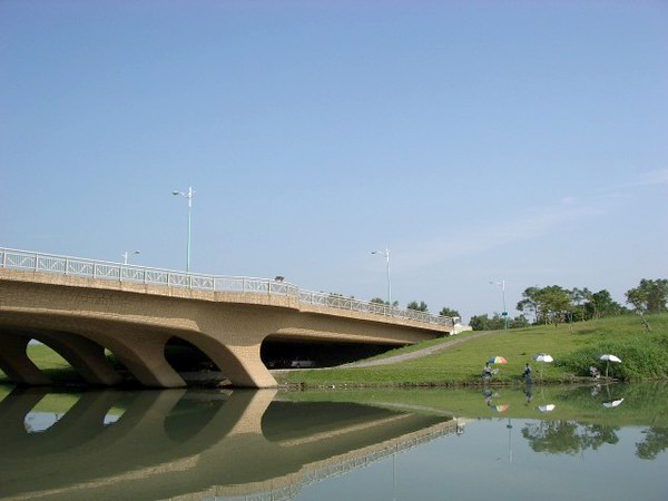 橋墩的基腳做成破水式的設計。連續拱形開口的護欄。[/nop]