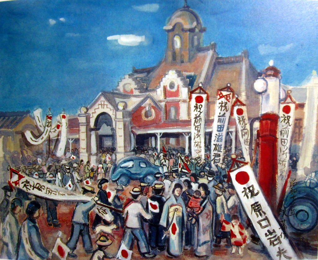 跳脫風景畫,李澤藩在社會人文作品,也多有關注。1938年《送出征》,是台灣美術史中描繪台灣庶民在日治期殖民生活的難得作品。畫作中的景點,正是巴洛克建築風格的新竹火車站前廣場,擁擠的人潮正在為被徵召為日本皇軍的台灣青年掛彩帶送別,畫家藉此作紀錄公學校同事前田滋雄被徵召為皇民軍的情景,值得注意的是,此作完成於二次戰爭爆發的前一年,完成後幾乎很少公諸於世,反而在畫家往生後才被美術史和藝評家引起注目。