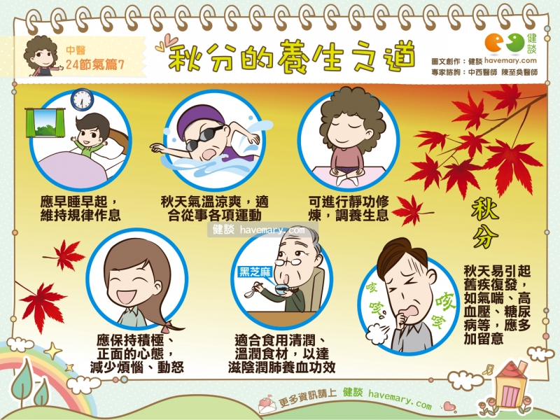1. 秋分起,北半球晝短夜長,生活作息應早睡早起,維持規律作息。