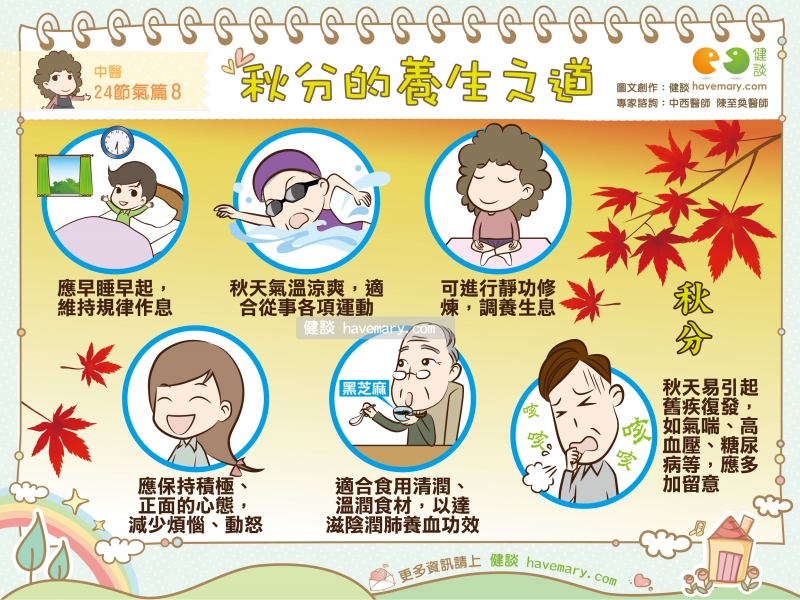1. 秋分起,北半球晝短夜長,生活作息應早睡早起,維持規律作息。