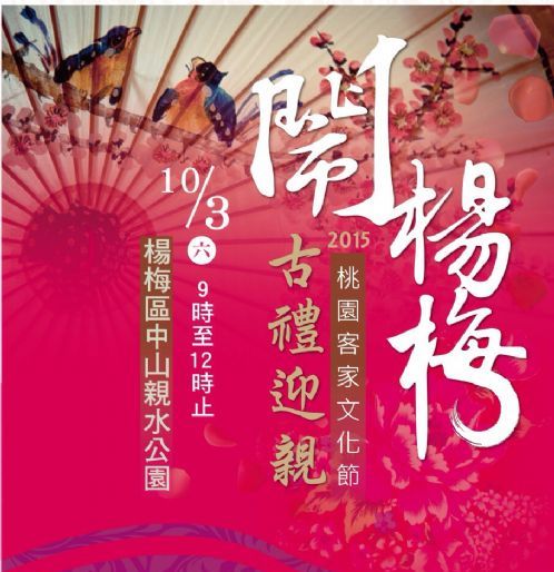 楊梅區公所升格後首次舉辦之「2015桃園客家文化節-古禮迎親鬧熱楊梅」活動,於104年10月3日(星期六)上午9時,在桃園市楊梅區中山親水公園(新農街78巷旁)熱鬧舉辦,包括「趣味古禮迎親儀式」、「DIY搓湯圓」、「歌舞表演」、「歡喜吃湯圓」等,期望透過老老少少的參與,讓居民感受像自己家裡辦喜事一樣。