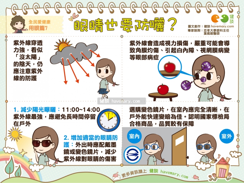 外出時,應配戴墨鏡以減少紫外線對眼睛的傷害。對於眼鏡族群若不方便攜帶墨鏡,也可考慮使用抗紫外線的變色鏡片,以達到眼睛防護的效果。