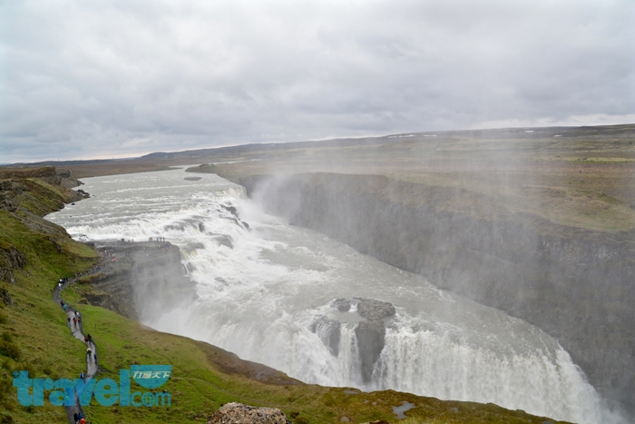 距離Geysir間歇泉不甚遠的黃金瀑布,是冰島大規模的瀑布之一,瀑布由高處奔洩而下分為兩段,高度落差約30公尺,最終由斷層處直洩而下甚為壯觀。沿步道走至瀑旁近距離觀賞瀑布,豐沛水量宣洩而下伴隨轟隆聲響,水勢滂礡又具震撼力,四周還有細細雨絲飄散空中,幸運的話,天晴陽光照射下還可見彩虹出現在瀑布處,是黃金瀑布最引人入勝的美景畫面。