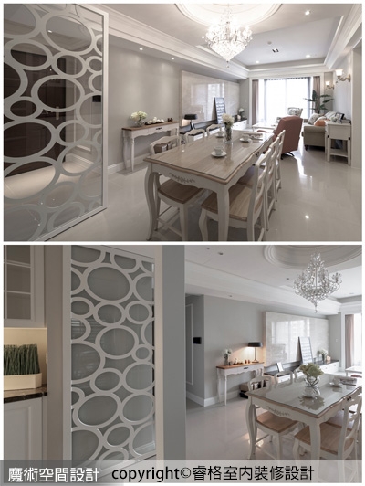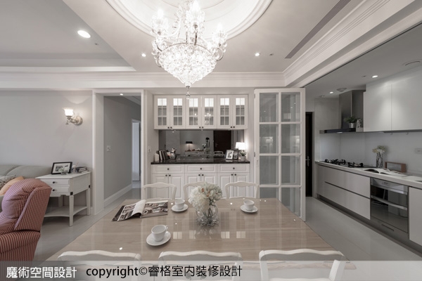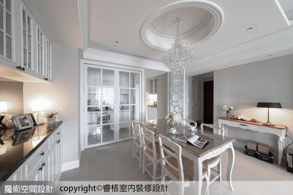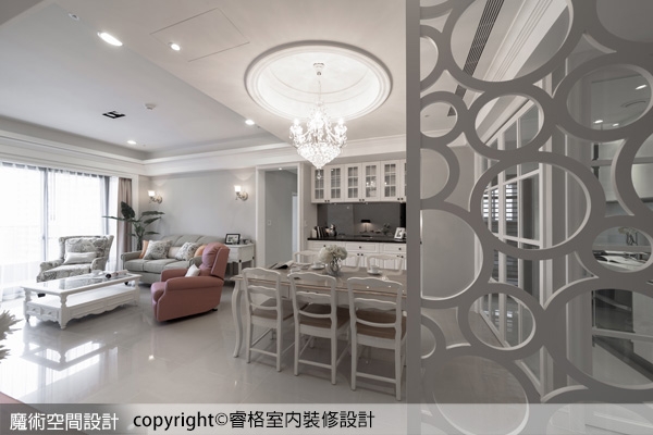 5. 【圖說】靈活的玄關隔屏造型以圓形表現,餐廳天花延續圓形語彙,以向上推高搭配垂降水晶燈飾,展現古典設計手法。