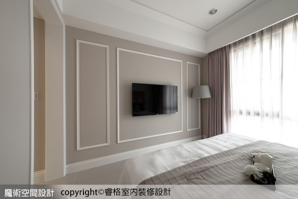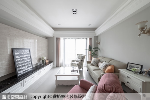 10. 【圖說】主牆以道地的美式新古典跳色粉刷,白線板勾勒簡約古典線條,調和出柔美的女性起居空間。