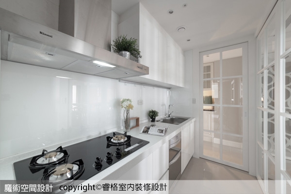 8. 【圖說】廚房在白格子玻璃拉摺門圍塑下,呼應了白色櫥櫃面板,更顯清新潔淨,通透感也大大降低了尺度上的侷限。
