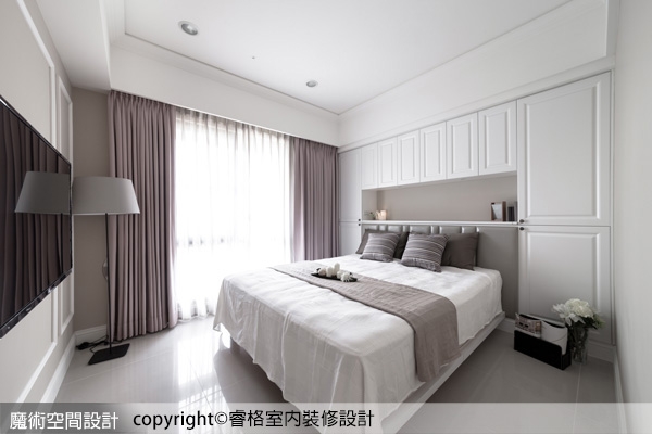 9. 【圖說】主臥室的床頭背牆為閃避大樑,在床頭做完整的收納櫃設計,收納功能強大。