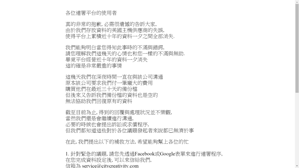 不少社運、環保、公民團體經常運用的指標性網路連署平台「台灣連署資源運籌平台」驚傳掛點!該平台上(9)月26日在臉書貼出公告宣布噩耗,「各位連署平台的使用者,真的非常的抱歉,必需很遺憾的告訴大家,由於我們存放資料的美國主機供應商的失誤,使得平台上累積近十年的資料一夕之間全部消失」,且無法回覆備份檔。