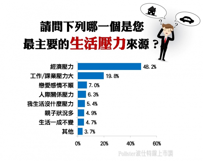 Pollster波仕特線上市調網針對1,674位受訪者詢問「請問下列哪一個是您最主要的生活壓力來源?」,結果顯示以「經濟壓力」的受訪者占多數,約為整體受訪者之48.2%;其次為「工作/課業壓力」,占19.8%;「戀愛感情不順」則排名第三,占7.0%。從此調查數據可得知,近五成(48.2%)的民眾最主要受「經濟壓力」的困擾;各有約兩成的民眾最主要的壓力來源為「工作/課業」(19.8%)及「人際相關」(包括戀愛、人際關係、親子關係)(18.2%);而僅有5%的民眾表示「我生活沒什麼壓力」。
