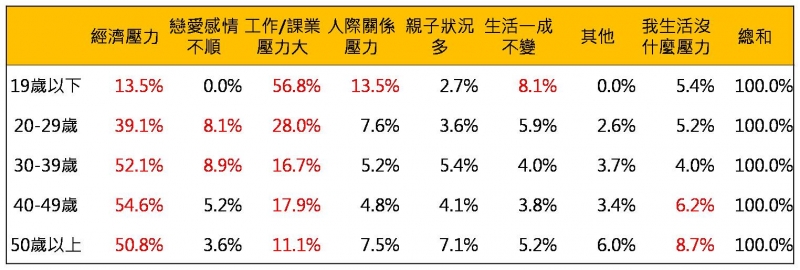 「20-29歲」:生活中最主要的壓力來源以「經濟壓力」(39.1%)最多,「工作/課業」(28.0%)次之,「戀愛感情不順」(8.1%)第三。
