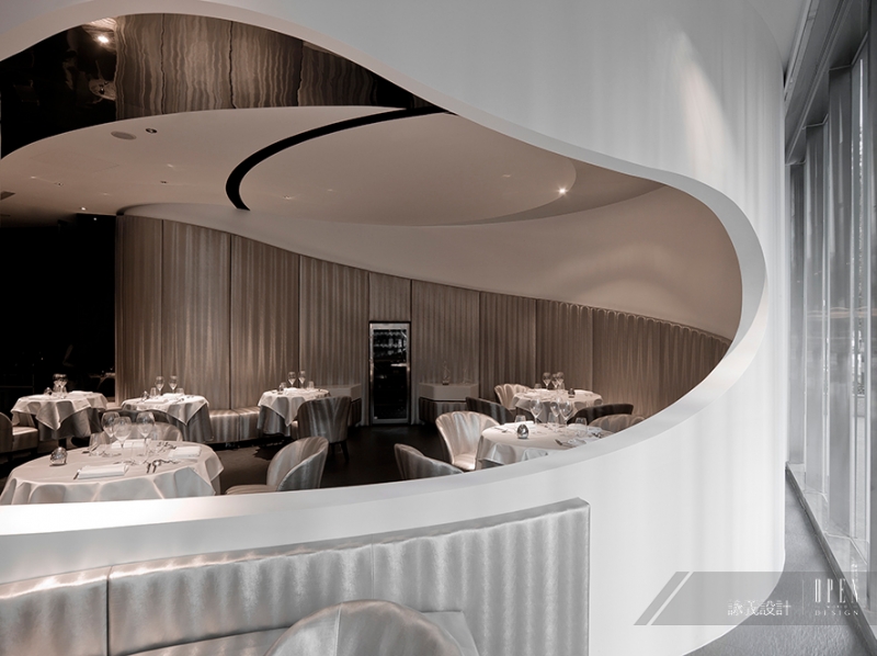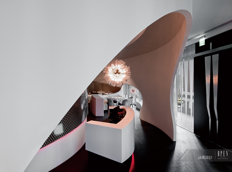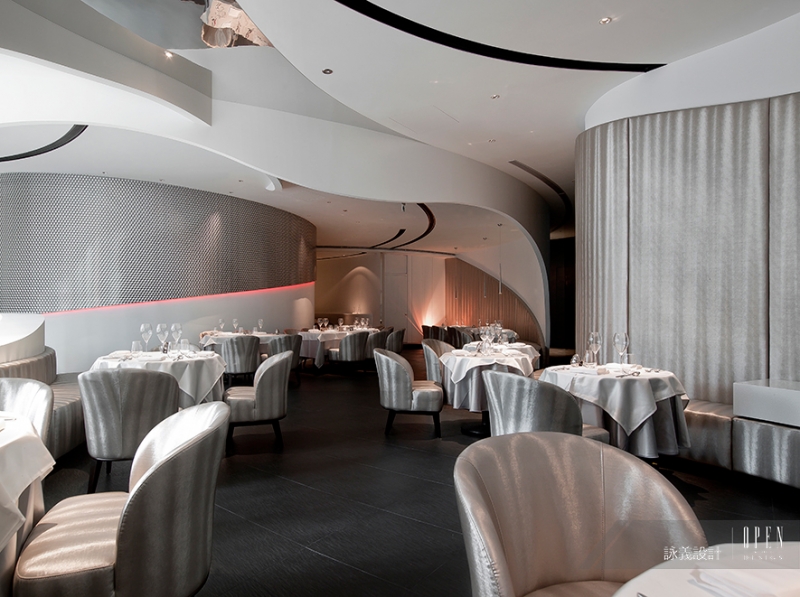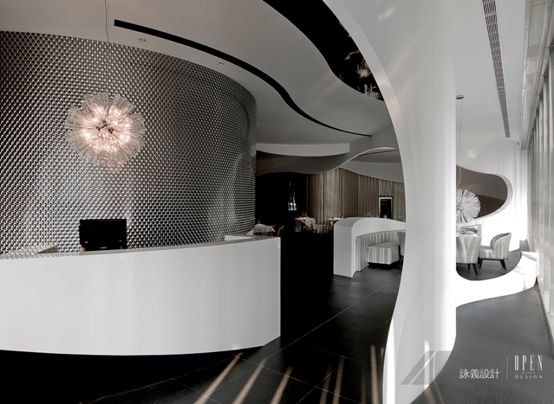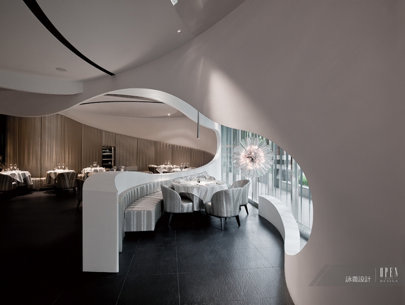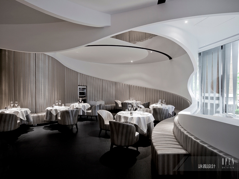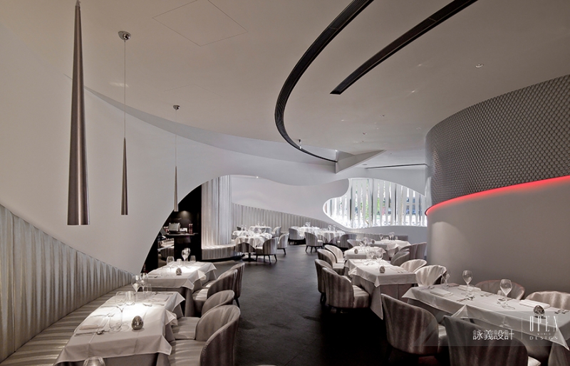詠義設計 劉榮祿 以純粹元素的概念結合藝術手法,將餐廳設計與分子料理結合;考慮到整體空間與動線規劃,設計師以弧線美學交織流體空間,重組設計分子,創造出不同以往的建築結構美感,使得餐廳搖身一變,成為宛轉交疊的電影場景,進而激盪出空間的蒙太奇。