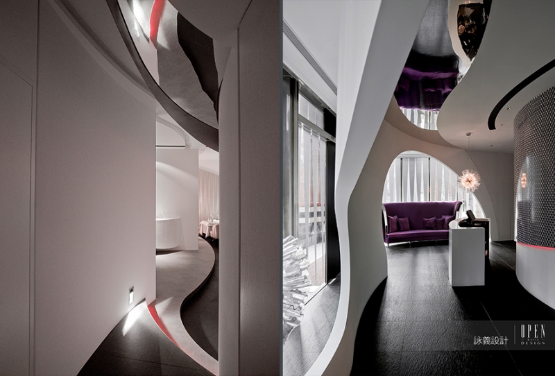設計師將原是一般的空間轉換成弧線量體空間,以具雕塑感的概念使得弧線空間不斷交織,勾勒出一幕幕的交影畫面。由於空間面的開展性,設計師以弧線為核心,在結構上使用不規則圓形與弧線相互交疊、延伸、交錯,呈現出穿透虛實的視覺感受。