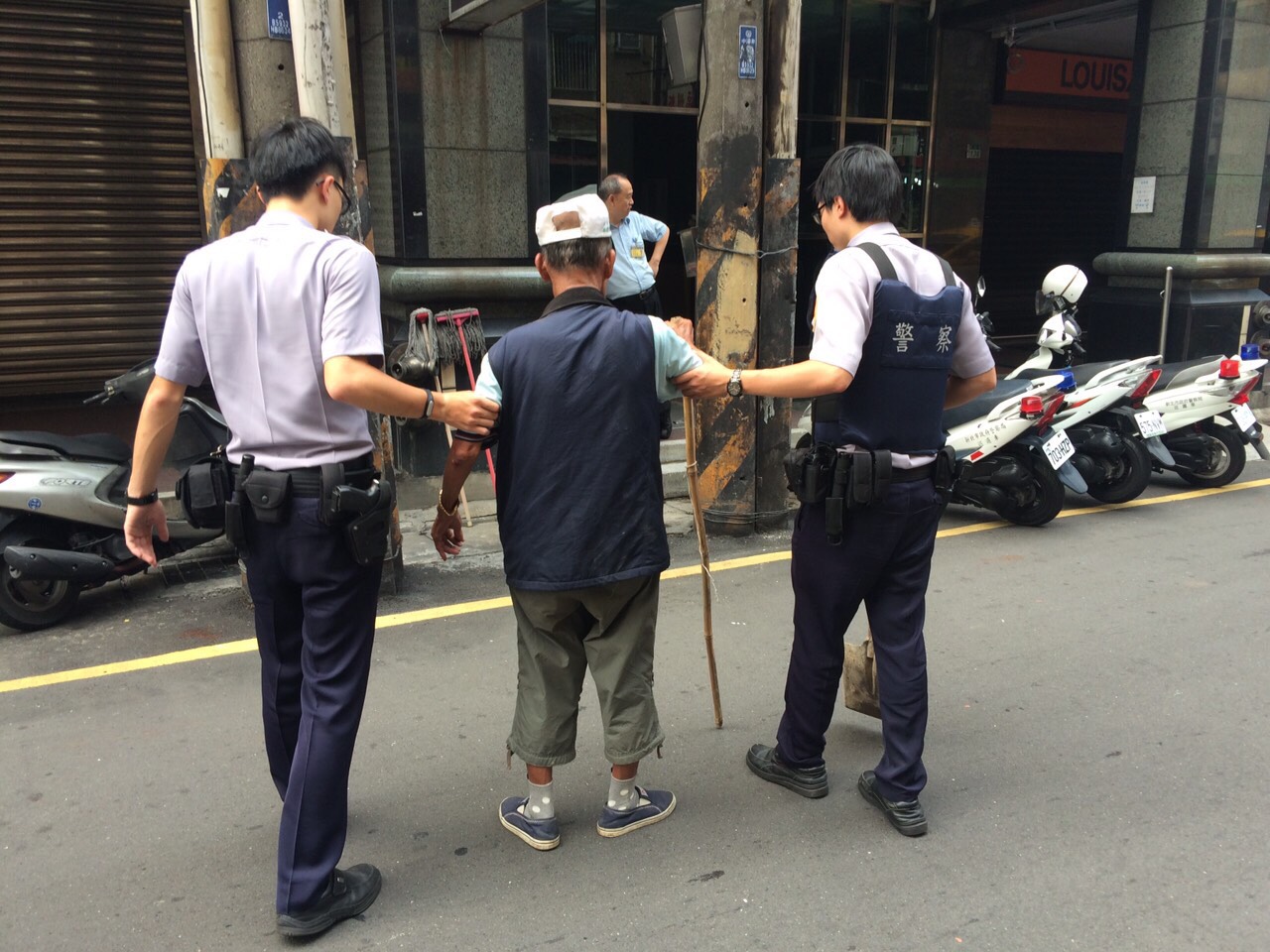 新北市政府警察局中和二分局員山派出所警員林振宏、于右平日前擔服巡邏勤務,巡邏行經新北市中和區員山路30號發現有名年約80歲男子臥倒路旁爬起後步行緩慢,隨時有摔倒的危險,因此護送該老翁平安回家。