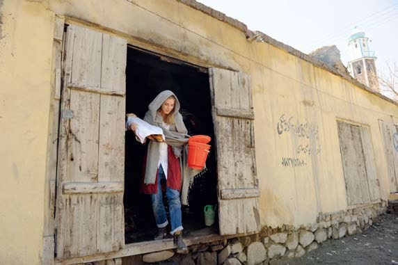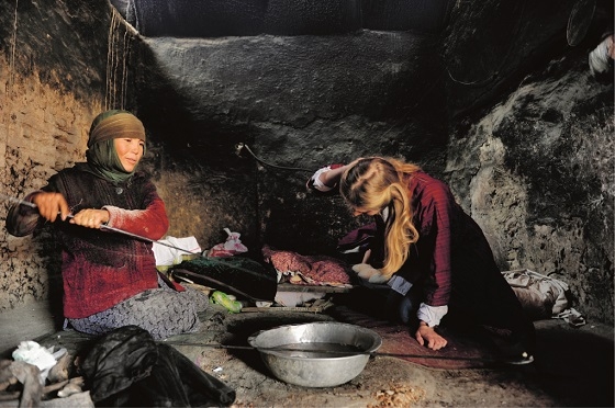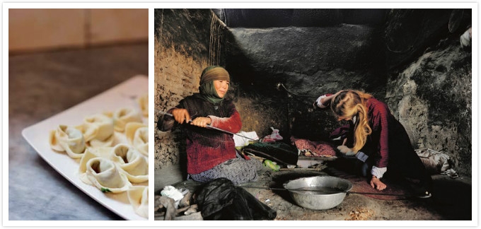 但瑪蘇馬的食譜則令人驚豔。煮完飯,我們將自己包在傳統阿富汗男士的羊毛帕圖中,坐在阿富汗地毯做成的大抱枕上,享受了一頓一起完成的晚餐。在瑪蘇馬的廚房裡,我們蹲坐在膝蓋上,直接在地上的一片油布上準備餃子。這是一個比較有效率的方式。瑪蘇馬的三個孩子在我們周圍爬著,男士們則在客廳裡等待,但他們抵不過好奇心作祟。我們都把焦點集中在瑪蘇馬身上。