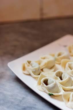 - 準備餃子皮:將麵粉和鹽加入一個大碗裡攪拌,在中間做出一個小凹槽,將水倒入凹槽中,用一支湯匙將麵粉混入直到變成一個麵團。先在工作檯上撒上一層麵粉(手粉)避免沾黏。將麵團分成二十四顆小球狀,在工作檯上將每顆小球擀開成一片片薄片,厚度大約1/16吋︱2毫米,再切成每片2吋︱5公分的方形麵皮。準備一小碗水,待會要用來沾濕手指以便封住餃子。在手掌上放一片麵皮,沾濕另一隻手的指尖,用濕的指尖畫過麵皮的邊緣。舀約1小匙份量的韭蔥內餡放入你手中的麵皮上,將麵皮對摺,蓋住內餡,呈現長方形的形狀,最後將兩邊的角抓在一起,現在看起來應該很像義式餛飩。