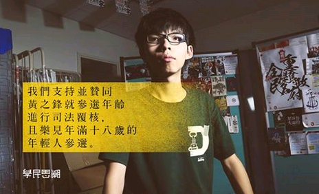 《學民思潮》(scholarism)10月12日發表聲明指出,他們向來深信,每個人都應享有平等的參選與被選舉權利;因此,我們支持並贊同黃之鋒,就參選年齡一事,進行司法覆核,且樂見年滿18歲的年輕人皆能參選。