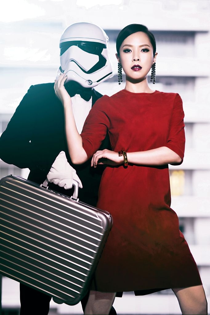 圖╱麂皮紅洋裝 NT$190,100;LANVIN水鑽耳環 價格請店洽;RIMOWA Attache大型手提公事包 NT$22,020;Dior Homme 西裝外套 價格請店洽;Dior Homme 白襯衫 價格請店洽;dunhill領結 NT$6,600;頭盔、皮革白色手套 私人提供