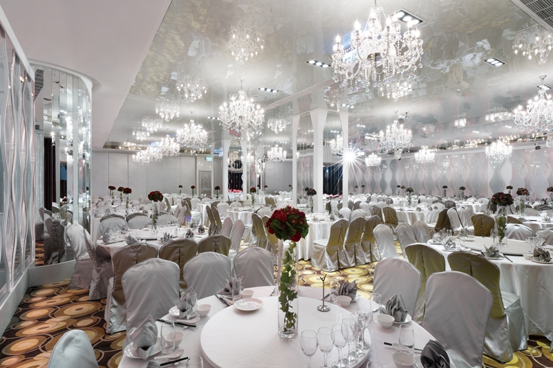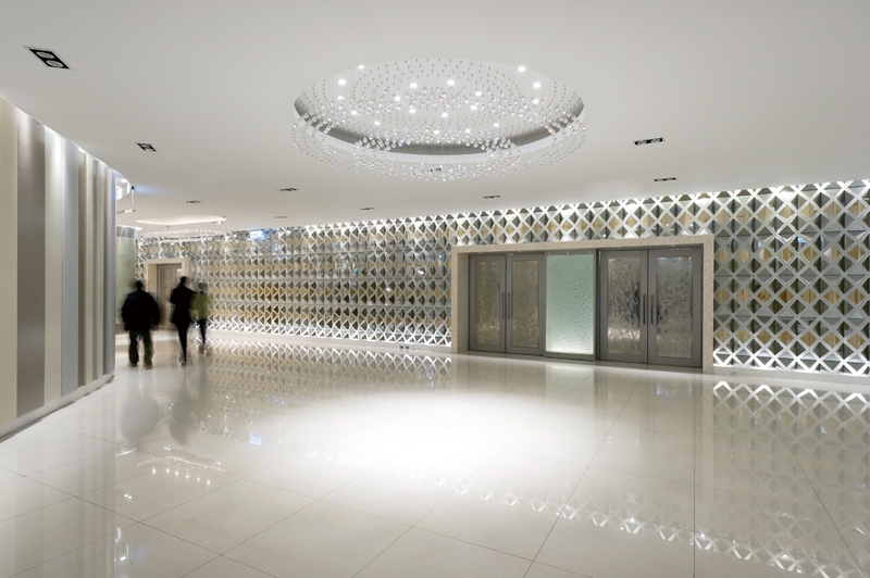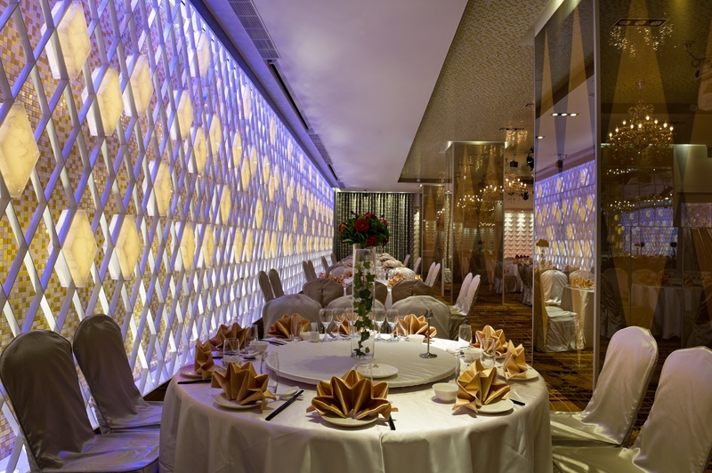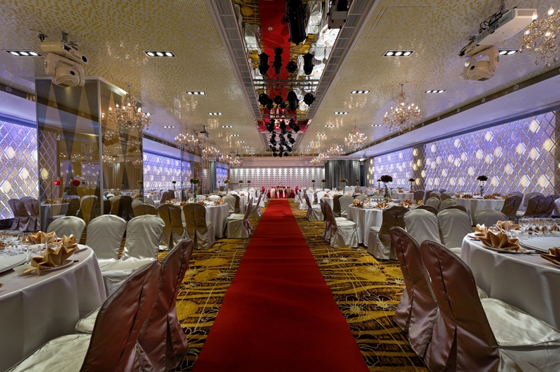 人即興演出的各種節目橋段,宴會廳採取直接表演的劇場概念呈現,以線條交錯詮釋舞台,融合低沉色系的空間,炫麗多層次的燈光變化揮灑於天花板及壁面襯底的玻璃馬賽克上,幻化成極具變化的屏幕;菱形燈盒則隨著表演劇情起落漸變光影,凝聚眾人目光。另一宴會廳則以柔曲的立面形體呈現,運用多層次的玻璃造型將光影層次染色其中,透過淨透的表面材質,鋪陳出極具舞台張力的表演背景,再將燈光影音系統整合於空間設計中,讓每場不同型態的活動聚會,都能在此淋漓盡致的釋放與揮灑。