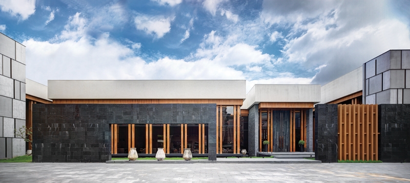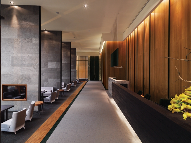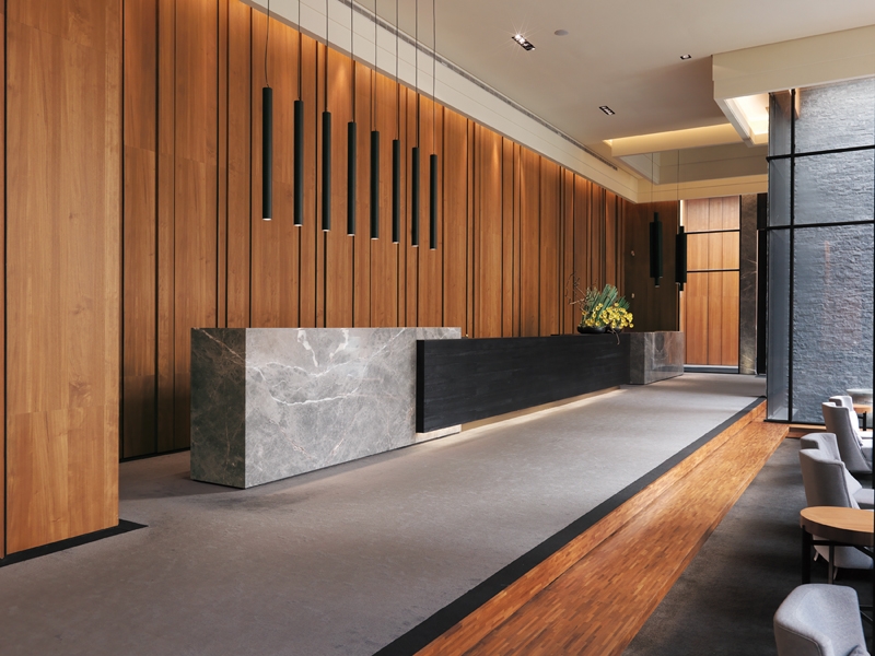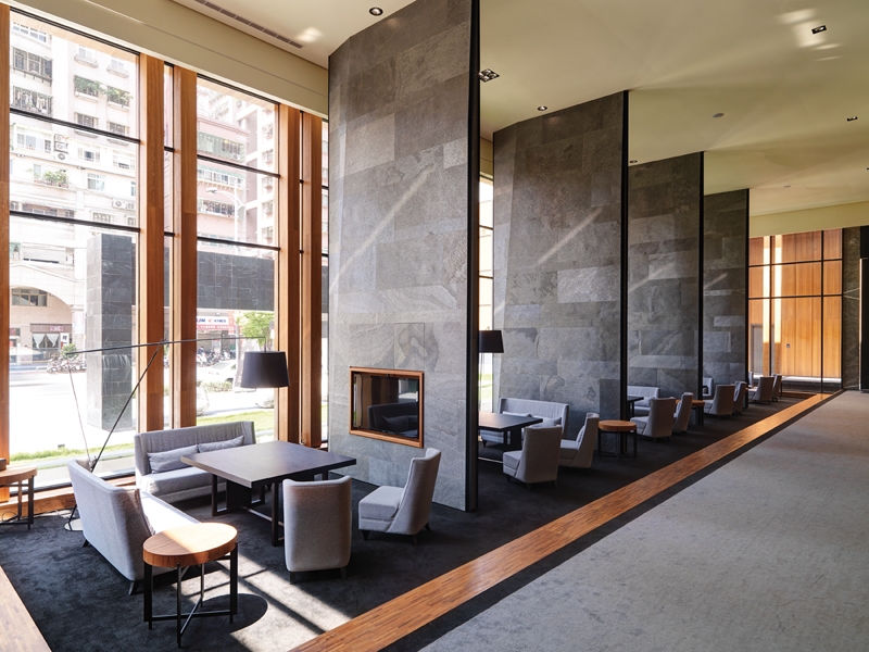 設計師將整體室內空間布局及動線依使用機能作出明確分劃,如廳堂、迴廊、院落、邊間,置中、轉緩、明快的空間格局,取樣自現代設計的收弛有度。接待櫃台延續大廳廊道地坪,再以異素材拼接的立體設計,對應石與木拼接的縱長塊體,淺深色度、異質紋理,宛若山林背景之中,雲霧流瀉;其實際效用則在於隱晦且優雅的暗示出主控櫃台區位。