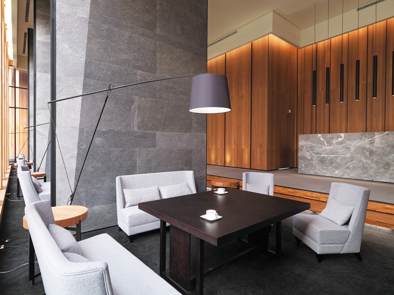 四座石板牆作為個別洽談區的隔分屏幕,精心量製的厚度恰可嵌入平板螢幕;深色木桌、淡灰沙發不走奢華高調,而是在望向窗邊由交織鐵件所框畫的水景與碧景,彼時,隨同心境,自身、外物亦不再截然有別,如同這座側居高樓群落一隅的水榭亭閣,悠然隱於市。