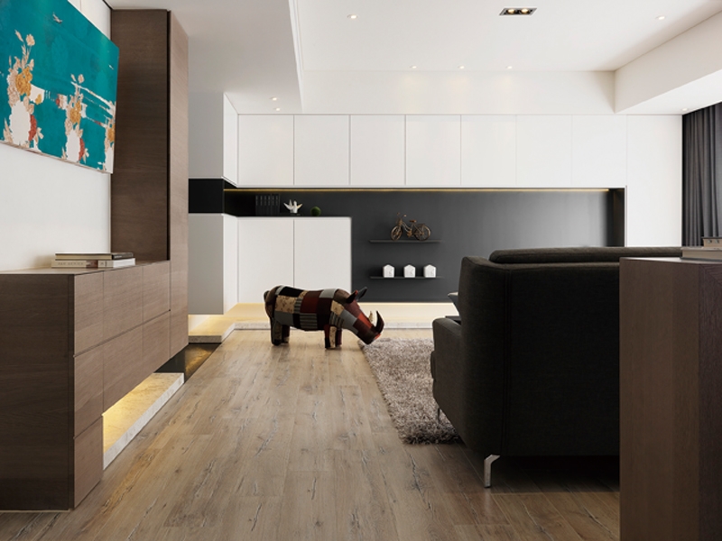 此次空間格局最大的特色在於運用開放櫃形式及開放空間,巧思的模糊視覺上對空間的界定。走入玄關處,印入眼簾的即是客廳與餐廳所融合的開放場域,設計師首先運用懸空式開放櫃以內凹方式設置於入口處;電視牆面則以粗曠黑鐵作為開放櫃的材質,光源內嵌於櫃下延伸及引導整座廳堂,搭配木製家具及布料,使整體空間的型廓轉譯成精緻且強調現代風格的空間語彙,溫潤馨雅的氛圍也油然而生。此外,為了界定玄關內外處,設計師使用大理石地板鋪面於入口處,與廳堂後漂浮式的木拼地板作地界的區分。