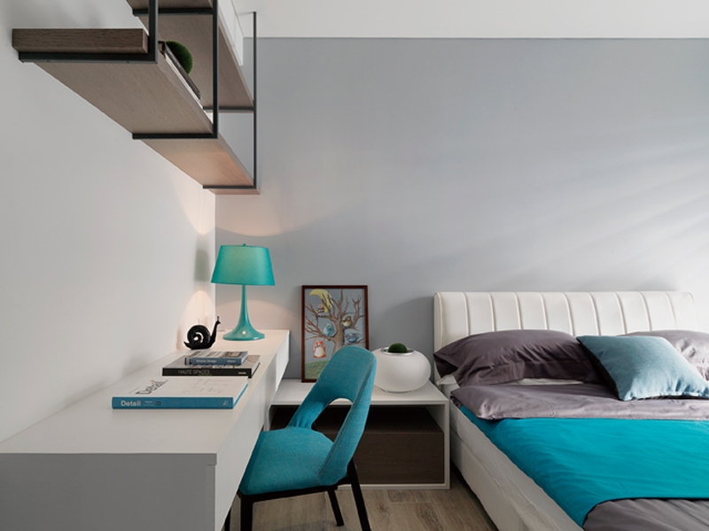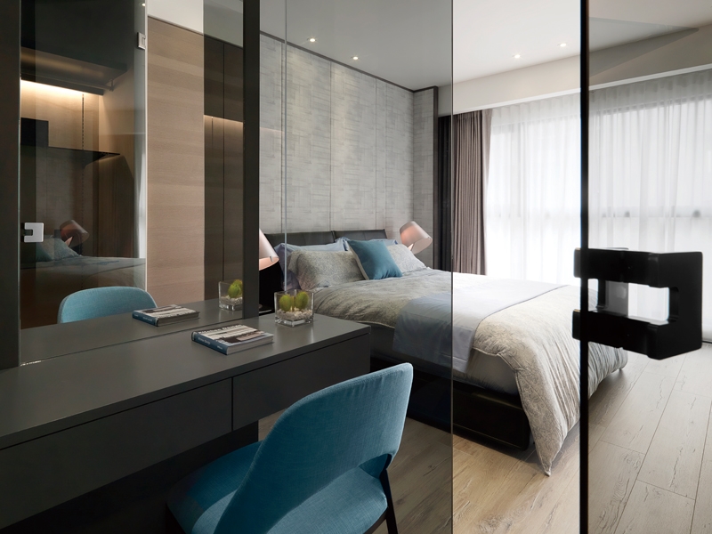 主臥處為了呼應整體空間設計概念,設計師使用灰玻圍塑更衣間,打造半穿透性的開放空間;在床前的壁櫃也機密式的將收納機能藏匿於內,使動線更加寬敞闊綽。而一旁的次臥,設計師刻意將靠牆展示櫃在面門方向添增了一處開放擺物架,使業主進入門房時,不僅能自然感受到場域活動的流暢度,也能減少空間帶來的壓迫性,達成業主所希望的高品質居家空間。這似乎也印證了毛鐿崴所定義的設計理念,「一個好的空間設計,就是當人進入這空間中時,能夠在完全放鬆及沒有壓力的情境下去享受這個空間帶給他的感受。」