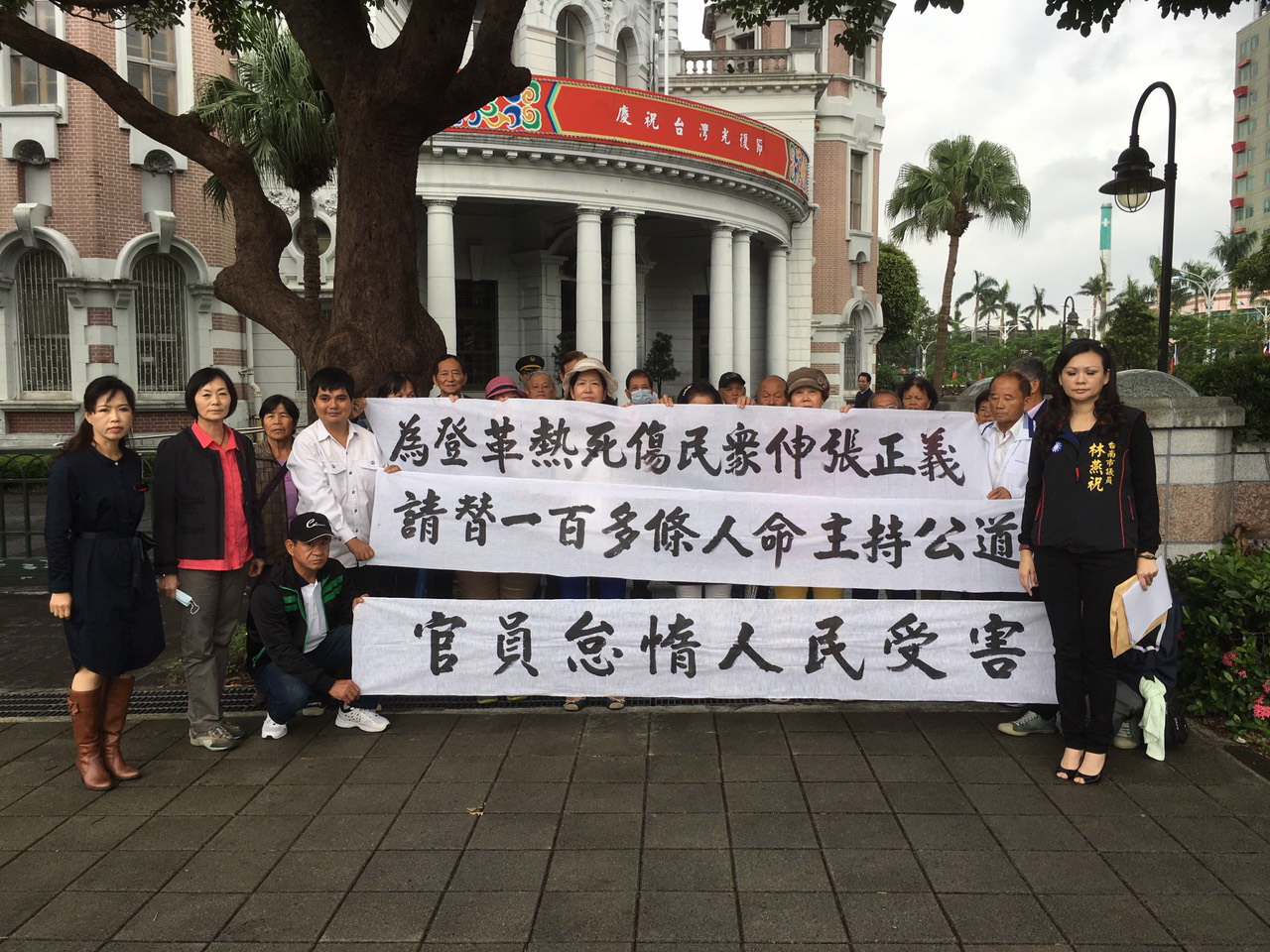 陳情民眾在監察院門口拉起「請替一百多條人命主持公道」、「為登革熱死傷民眾伸張正義」、「官員怠惰人民受害」白布條,表達對台南市登革熱延燒的憤怒,由台南市議會國民黨團市議員林燕祝、林美燕陪同北上遞交陳情書,過程理性。