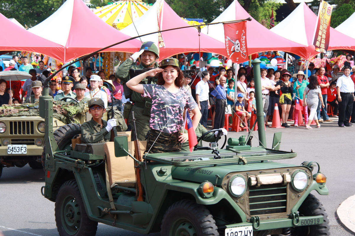 圖說:前藝人小潘潘帶領扮演早期軍人角色團隊進場十分威武。(記者扶小萍攝)