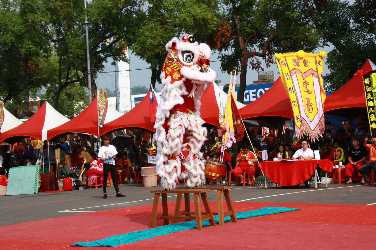 圖說:國內外醒獅團精彩競技,新加坡關善壇學院技藝精湛。(記者扶小萍攝)