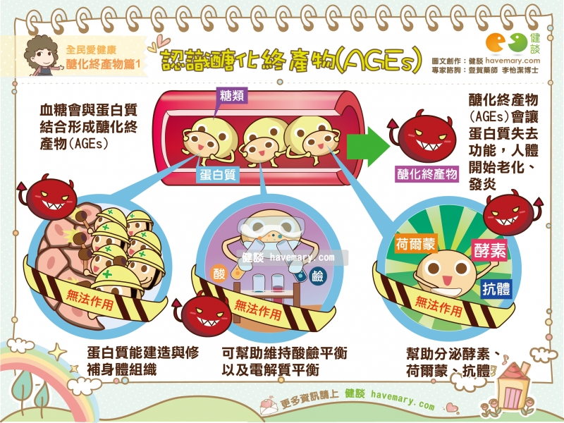原本蛋白質具有許多身體必須的功能,如建造與修補身體組織、幫助酸鹼和電解質平衡、協助身體分泌酵素、荷爾蒙、抗體等,會因為醣化終產物,而使得蛋白質無法作用。