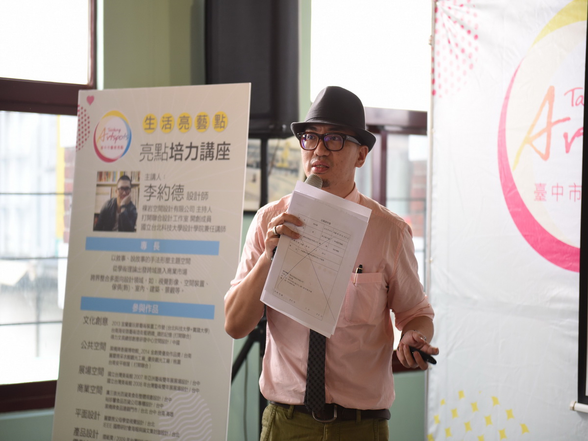 講座部分,由裸岩空間設計公司主持人、打開聯合設計公司創始成員李約德設計師以「打造藝文亮點」為主題進行培力講座,以自身打造臺南海安路藝術造街藍晒牆以及臺南黑橋牌香腸博物館的經驗,提供出席貴賓許多難能可貴的建議,包括空間規劃、視覺設計、商品展示、藝文策展、企劃行銷等面向,用說故事的方法分享如何打造出令人耳目一新的藝文空間。現場集結超過20家藝術亮點參與,包括臺中慈濟醫院、大里仁愛醫院、童綜合醫院、中山醫學大學附設醫院、東勢區農會附設農民醫院、夏卡爾藝術屋、福宴國際創意美食、中友百貨時尚藝廊、活力咖啡館、若茵農場、文華道會館、星享道酒店、全安堂台灣太陽餅博物館、巴比音樂美語短期補習班、永豐商業銀行興大簡易型分行、日月千禧酒店、翔韻音樂教室、惠弘茶文化生活館、幸發亭蜜豆冰本舖、猿緣園藝術館、正太筆墨坊、勤美術館、承億文旅台中鳥日子、紅磚民歌西餐廳等,各亮點業者紛紛在全安堂臺灣太陽餅博物館以「藝」相會。