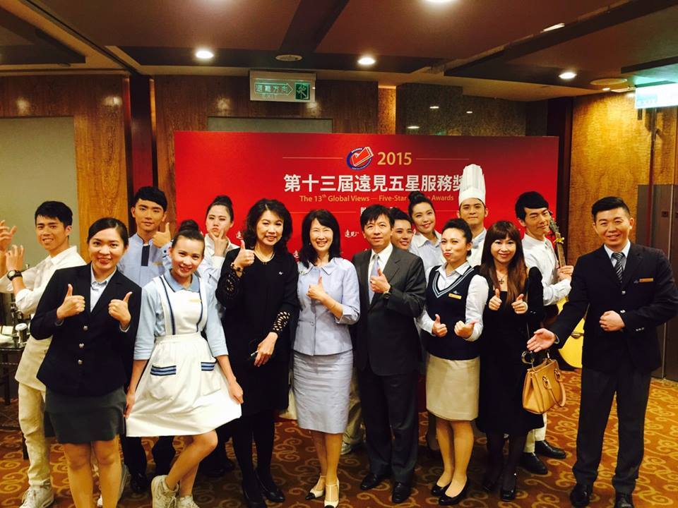 圖說:遠見五星服務獲獎,雲朗觀光辜懷如董事長以及雲品國際盛治仁董事長到場與雲品陳惠慈總經理以及雲品各部門代表同仁一同領獎同歡。