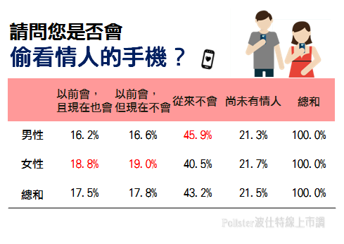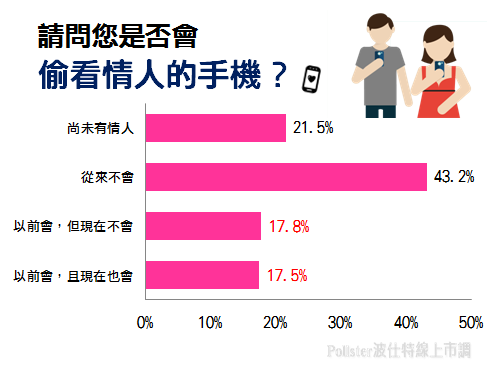 Pollster波仕特線上市調網詢問「請問您是否會偷看情人的手機?」。調查結果顯示「從來不會」偷看情人手機的受訪者有43.2%,「以前會,但現在不會」的受訪者有17.8%,「以前會,且現在也會」的受訪者占17.5%,而有21.5%的受訪者表示尚未有情人。也就是說,有35.3%的受訪者都有曾經偷看過情人手機的經驗。