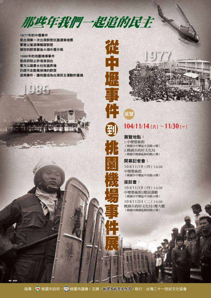 1977年的中壢事件,是台灣第一次出現群眾抗議選舉做票,軍警以催淚彈驅趕,群眾火燒中壢分局。1986年的桃園機場事件,是政府阻礙許信良回台,軍方以鎮暴水柱和直昇機仍趕不走數萬群眾,這兩事件,讓桃園成為台灣民主運動的重鎮。
