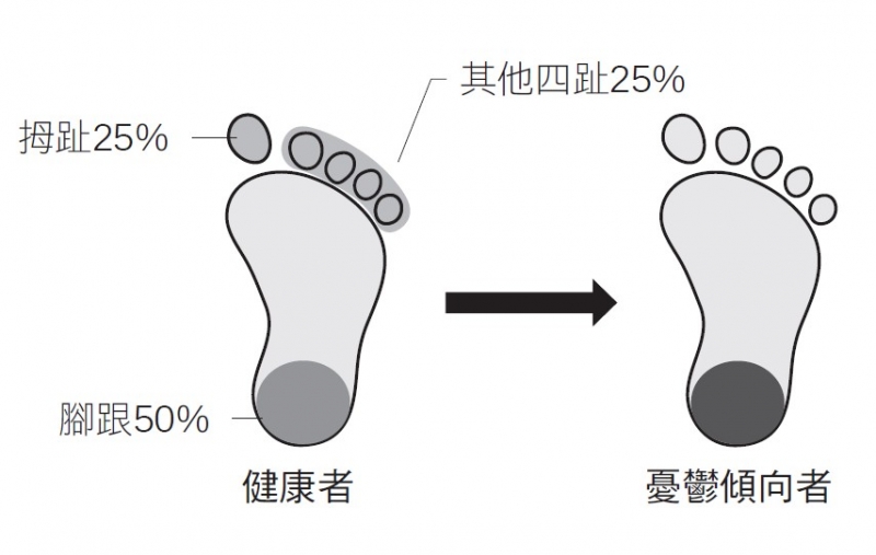 健康者的走路重心會放在腳底中央,也就是拇趾底部25%、另外四趾25%、腳跟50%;但腦部已出現慢性疲勞者,因重心失去平衡而導致走路方式改變,使得腳跟傾斜和磨損。