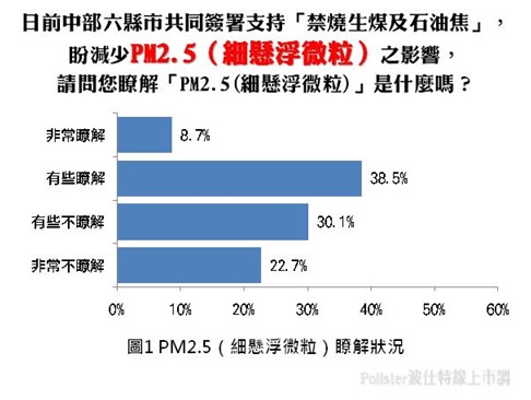 近年來南部地區空氣污染情形漸趨嚴重,雲林縣、嘉義縣市、台南市、台中市、彰化縣等六縣市政府,共同簽署支持「禁燒生煤及石油焦」,以盼減少主要污染源PM2.5(細懸浮微粒)之危害,根據市場調查(註),進行是否瞭解「PM2.5(細懸浮微粒)」?問卷調查。調查顯示,「非常瞭解」占8.7%,「有些瞭解」占38.5%,而「有些不瞭解」與「非常不瞭解」則各占30.1%及22.7%。結果顯示,逾半數民眾對PM2.5並不瞭解。