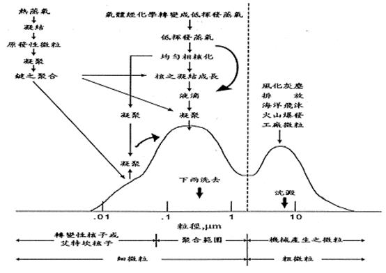 粒徑分布及來源 (資料來源:火力電廠空污排放對細懸浮微粒(PM2.5)之影響與因應對策研究)