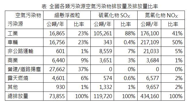 依據行政院環境保護署空氣污染物排放清冊(Taiwan Emission Data System, TEDS)8.1版顯示,臺灣細懸浮微粒主要污染源包括工業、車輛、營建/道路揚塵、商業活動及露天燃燒;硫氧化物污染源則主要為工業及非道路運輸;氮氧化物污染源主要為工業、車輛及非公路運輸(如表),其中;營建/道路揚塵、工業與車輛共佔80%貢獻度。國內原生性污染源對各縣市細懸浮微粒濃度的貢獻均超過30%,有些直轄市、縣市甚至超過50%包括:台北市、桃園市、新竹縣、苗栗縣、台中市、彰化縣;原生性貢獻度超過40%的縣市佔了全部縣市的68%。國內衍生性貢獻主要在南投縣、雲嘉南及高屏空品區,貢獻比率約20%至 35%之間。