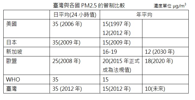 美國環保署於1997年訂定新的空氣品質管制標準,分別訂定懸浮微粒為PM10與PM2.5兩種標準,並加入統計學之觀念,最起初之PM2.5標準定為年平均濃度為15μg/m3,日平均濃度標準則訂為65μg/m3 (三年期間之98%累積頻率),而後分別於2006年修訂日平均標準(35μg/m3),2012年修訂年平均標準(12μg/m3),而歐盟於2008年公告PM2.5年平均濃度的環境目標值為25μg/m3,2015年正式成為法規值;日本也於2009年提出PM2.5相關管制標準,內容與美國相同(2012年修訂前)。國內為提昇環境品質及維護國人健康,臺灣則於101年修正空氣品質標準,增訂PM2.5空氣品質標準為24小時值與年平均值分別為35 µg/m3與15 µg/m3。然而,以最近環保署台南自動監測站資料顯示,24小時值超過35 µg/m3,且這樣的監測結果於其他中南部各站亦有類似的情形。
