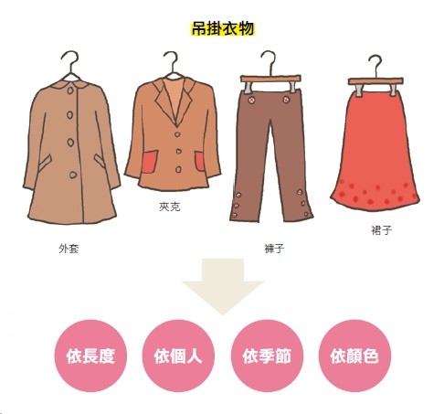 依照家庭成員分類,例如「先生的衣物」、「太太的衣物」,再來規劃收納的空間。