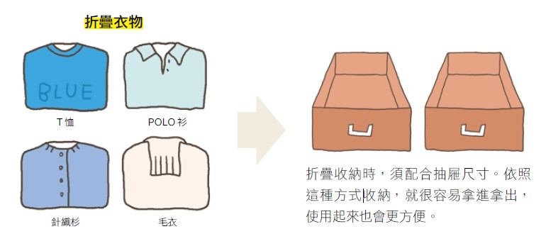 光靠不同的折疊方式,就能把衣服收納得很整齊,所以大家要學會如何正確地折疊衣物,再收納於衣櫃中。