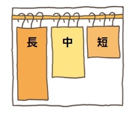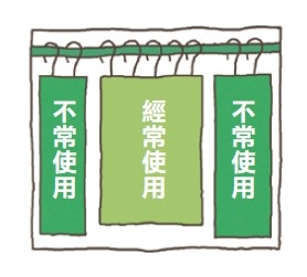 →先分門別類後,再吊掛起來收納。所謂的分門別類,是指依照功能或用途,有效率地進行分類。可依照不同長度、每個人、季節、顏色等進行分類後,再加以收納。