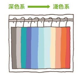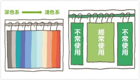 依照「深色系」、「淺色系」、「暗色系」、「亮色系」等不同顏色分類,搭配衣服時就能一目了然。