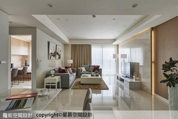 (8)【圖說】客廳天花部份以間接光源設計,讓光線更為明亮而柔和;其間以單純因子鋪排,強調空間樸雅質感。