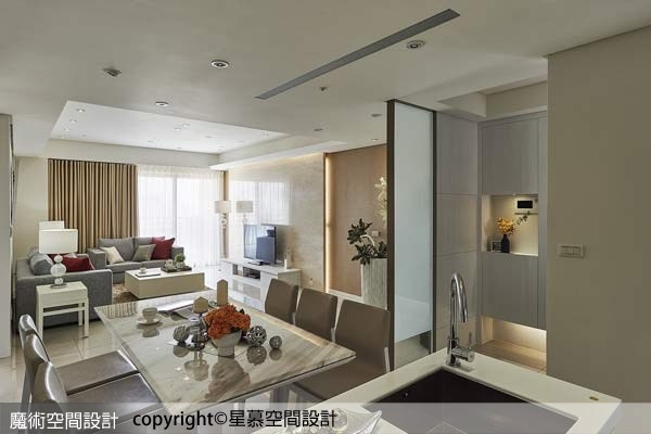 (5)【圖說】客、餐廳採開放空間安排,同時強調光線與色彩均能相互調合,設計間接光源以融合餐敘時所需的寧致。
