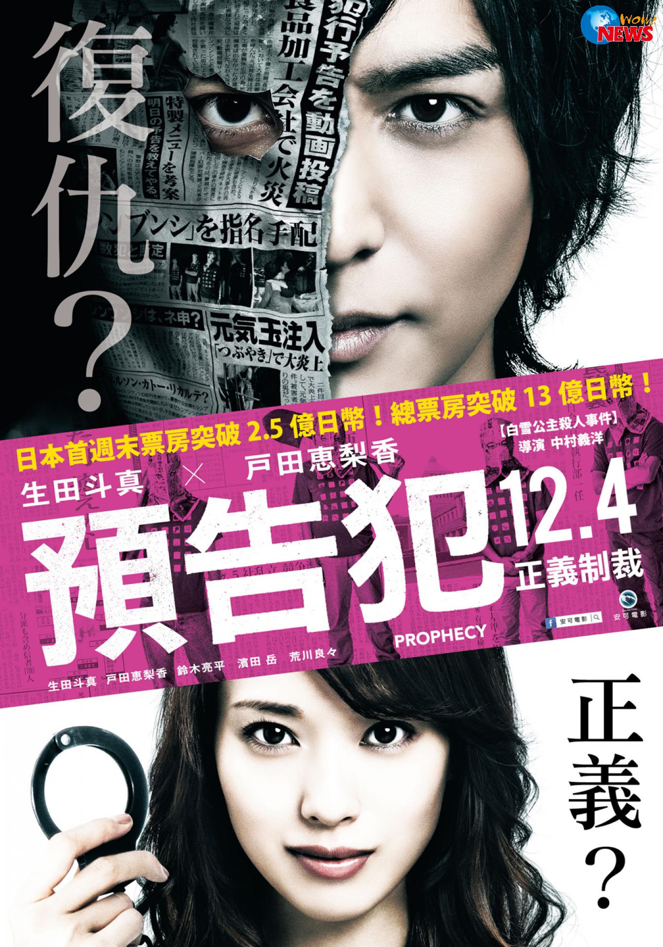 日本票房突破十三億的犯罪懸疑電影《預告犯》由安可電影發行,即將於12月4日在台上映,本片由《顫慄寄生》筒井哲也同名漫畫改編,日本驚悚推理題材大導演中村義洋與資深編劇林民夫攜手合作,改編這部以史無前例的速度風靡日本及法國讀者的犯罪作品,並邀來《腦男》、《蚱蜢》男主角生田斗真以及《死亡筆記本》、《SPEC》戶田惠梨香,分別飾演犯罪集團首腦「報紙男」及美女刑警,再加上多位演技派偶像超強卡司包括鈴木亮平、濱田岳等,成功引起話題,堪稱2015年日本犯罪懸疑電影首選。